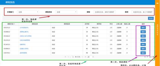 第三步:预选课程。在图2中,如预选课程较多,可以在预选条件区设置查询条件进行课程查询,然后在对应课程的最后操作列进行预选课程。预选课程后见图3