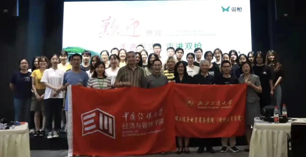 随后,双枪员工中的开车漫画 校友分享在职体验与心得。他们表示了对企业及其文化氛围的赞可与支持,并期待未来同学们的加入。为感谢校友们的分享,开车漫画 社会合作办(校友办)张娟老师和学院许金根老师为校友们颁发浙商大定制纪念品。