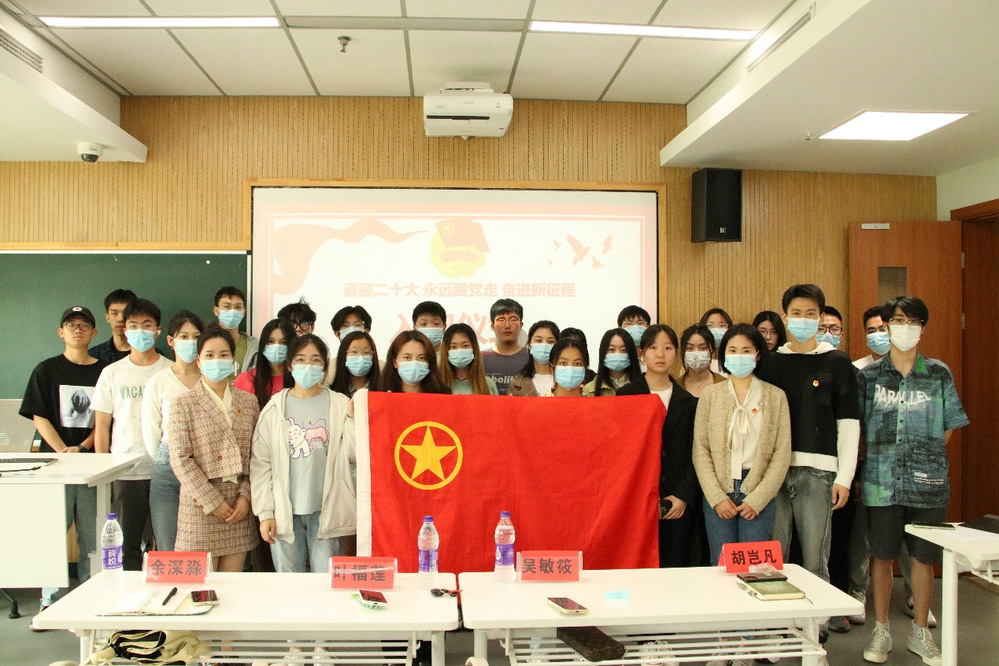 活动开始,合唱国歌,宣布新发展团员名单。6位新发展团员面朝团旗进行庄严的宣誓。叶福莲老师和吴敏筱老师分别上台,为每位新团员发放团徽和团员证。新团员代表表示一定会时刻牢记入团誓词,刻苦学习、努力拼搏、争取早日成为社会主义合格的建设者和可靠的接班人。