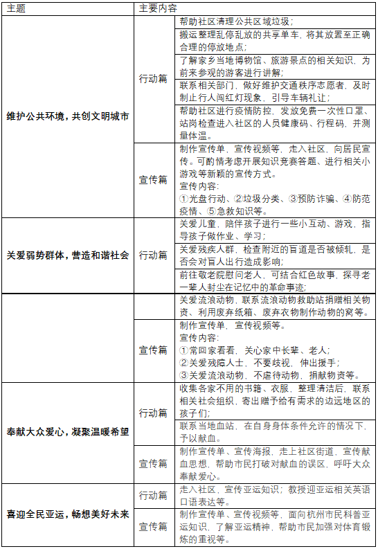 本次比赛活动评比时间为2022年10月末,各参赛团队在比赛期间积极组织志愿策划,鼓励创新。具体志愿活动策划可参考策划案末尾表格。