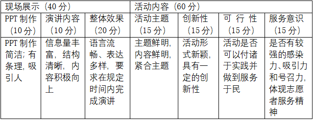 以团队为单位开展志愿活动策划案评比,团队成员需在5-10人,合作撰写志愿策划案。志愿活动评比包括前期准备、中期策划、路演汇报三部分。