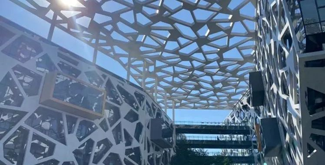 站在园区前向内望去,窗花图样的网纹穿插,叠置出丰富的视觉层次,大气的白色网状结构凸显着阿里开放、自由的互联网思维。