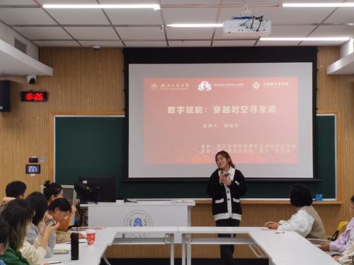随后,来自马克思主义学院“星火”宣讲团的杨建萍同学围绕二十大主题分享数字中国党课板块,全体党员认真学习。其中,杨建萍同学以精彩的AR、VR动画展示,强调了电子商务与软件工程的专业共通点,并鼓励大家积极学习党的二十大报告并投入精力于研学专业知识,用内心感应时代脉搏,务实为祖国作出贡献。