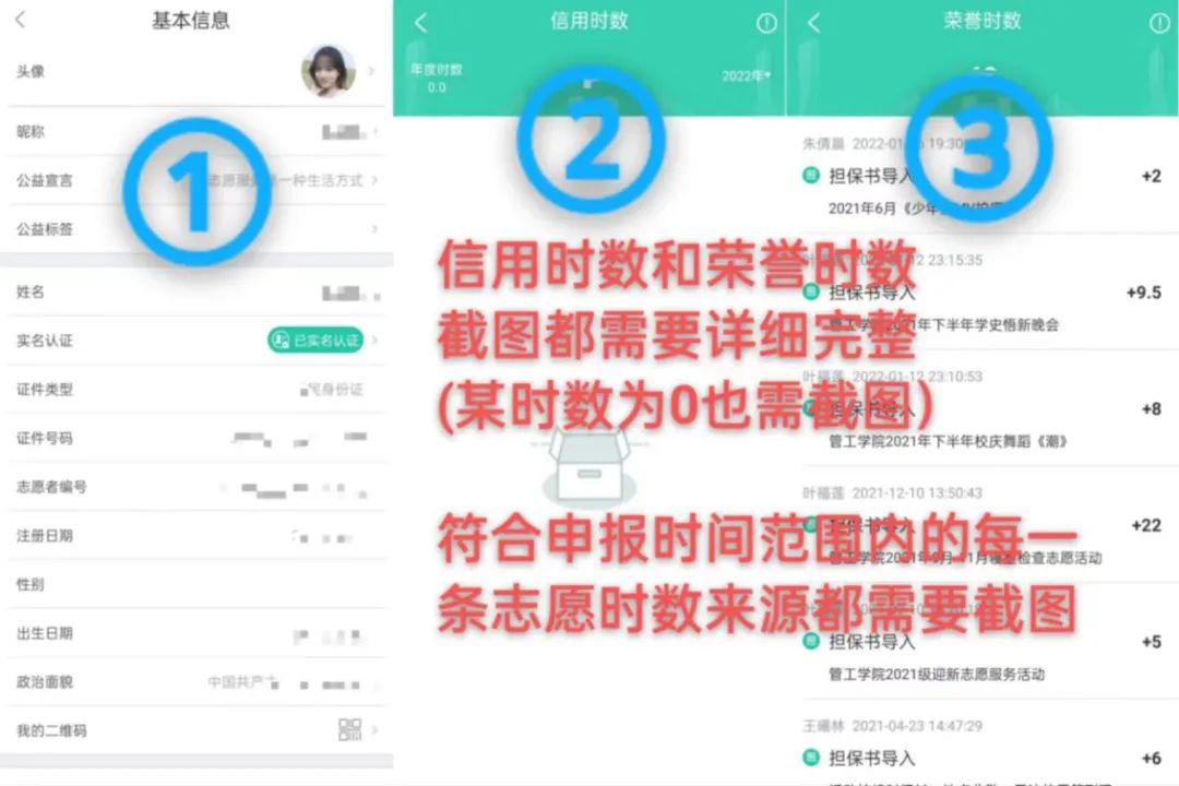 需要图示三份材料,荣誉时数与信用时数的截图都需要截完整。