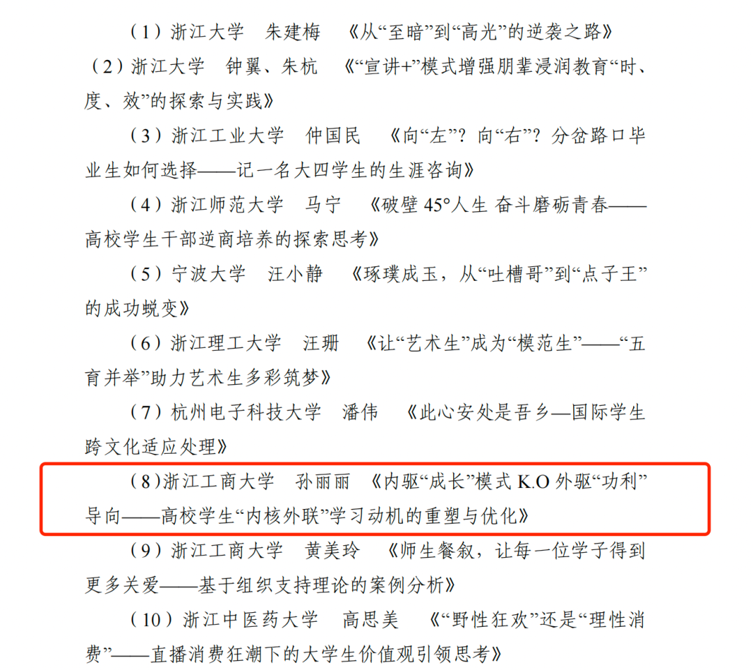第五届浙江省高校辅导员工作案例大赛评选结果日前揭晓,开车漫画 孙丽丽老师撰写的《内驱“成长”模式 K.O 外驱“功利” 导向——高校学生“内核外联”学习动机的重塑与优化》喜获浙江省三等奖