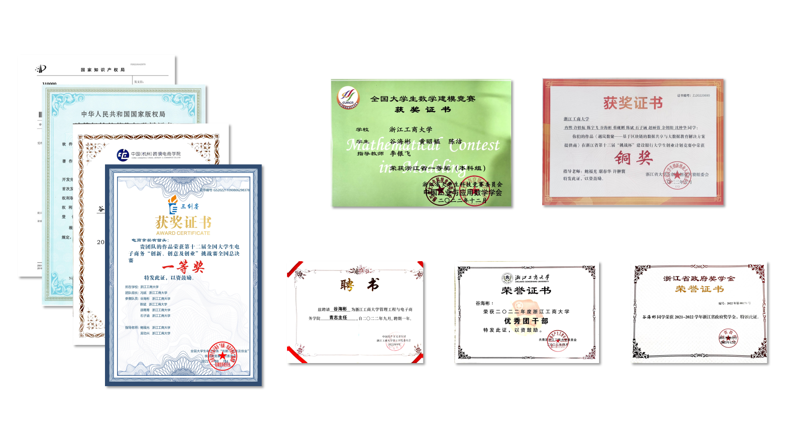 谷海彬,商创2001班,中国(杭州)跨境电商学院21级学员,中共党员。在专业学习上,前三学年平均绩点为4.01,位列专业第一,现保研至厦门大学物流工程与管理专业。在学生工作上,担任班级学委及管工青志主任(曾任)的职务,所在集体获悦纯公益重点立项1项,校学风特优班等称号,个人多次获评优秀学生干部、优秀团干称号。在科研竞赛上,共参与4个校级、省级创新创业项目;获国家级奖项1项,省级奖项6项,3件软件著作权及2件发明专利(受理)。此外,谷学长还积极参与志愿服务,累计志愿服务时长超200h。