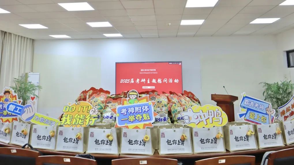 学院为考研学子们精心准备了“包你上岸”管工文创帆布包,“一举夺魁” 周边挂饰、“鼠你最牛” 三只松鼠能量提升包等,心意与干货并驱,活动现场气氛热烈,21级考研学子纷纷前来感受这难得的放松时刻。