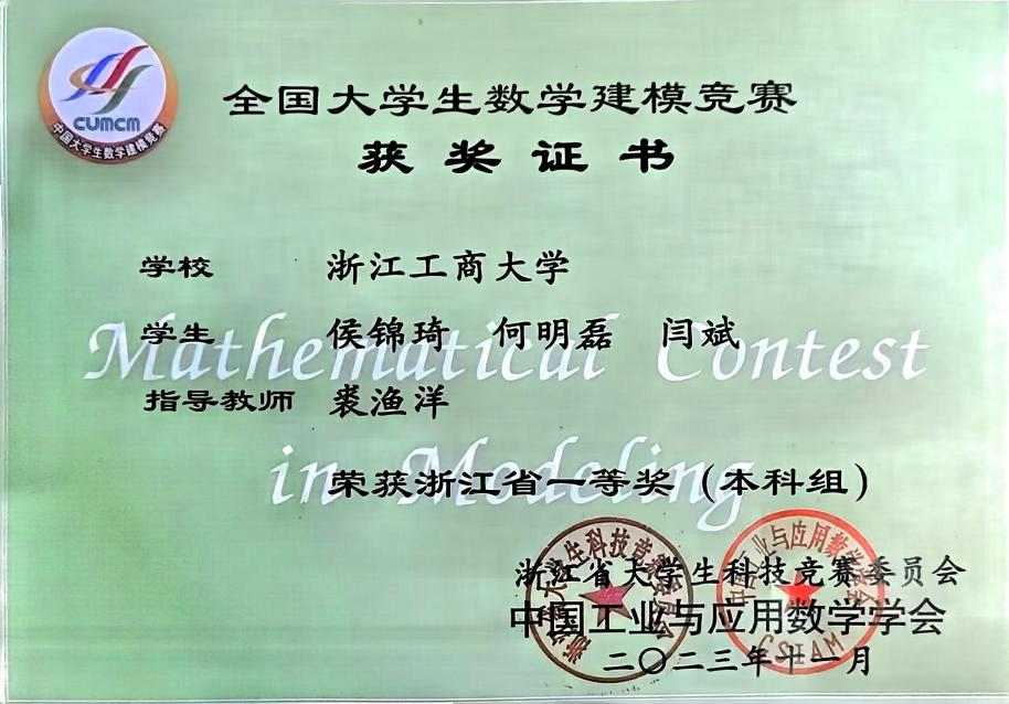 全国大学生数学建模竞赛浙江赛区一等奖(1/3)